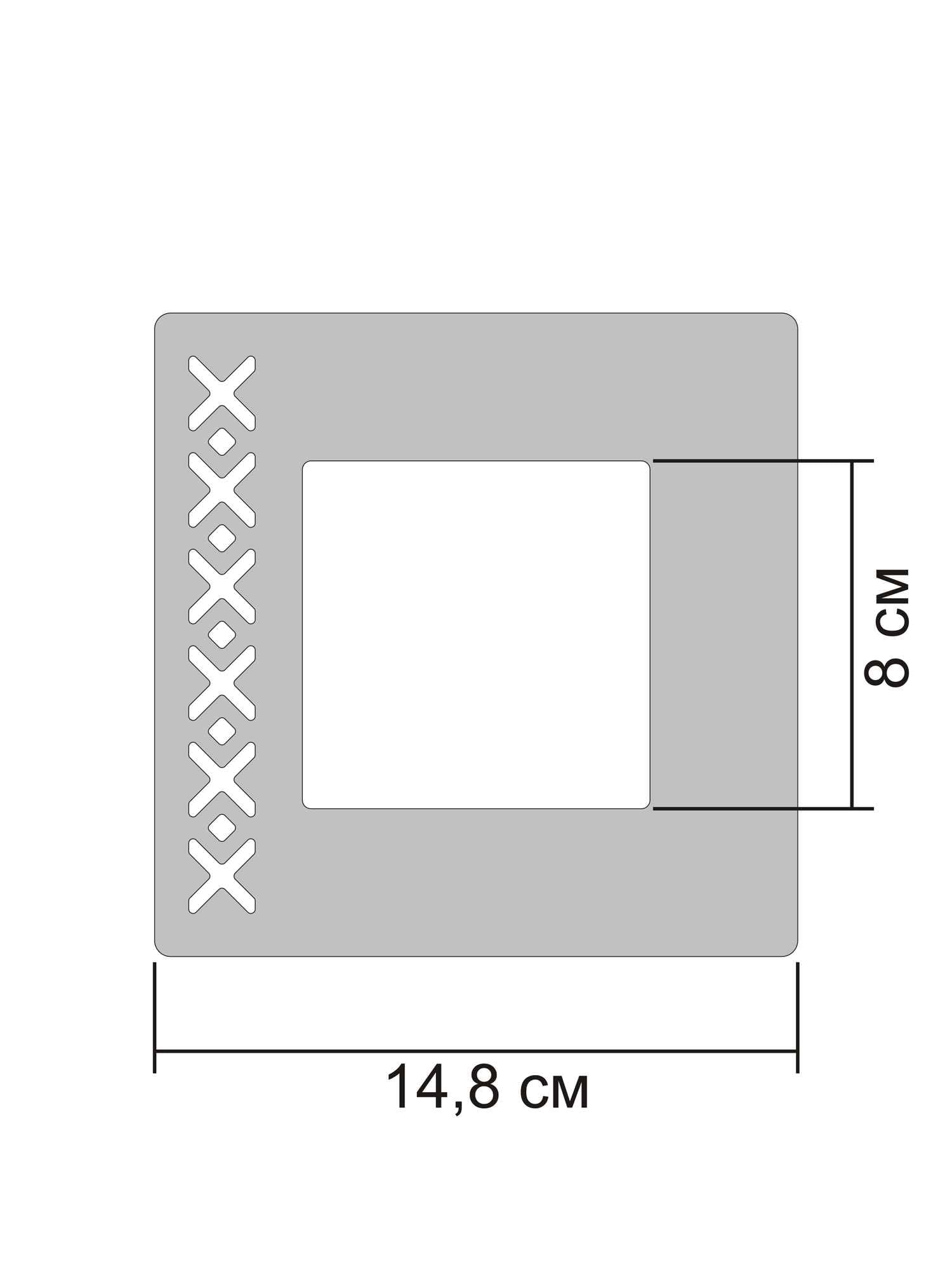 Розміри: 14,8*14,8 см, внутрішній виріз – 8*8 см. Товщина – 0,8 мм.